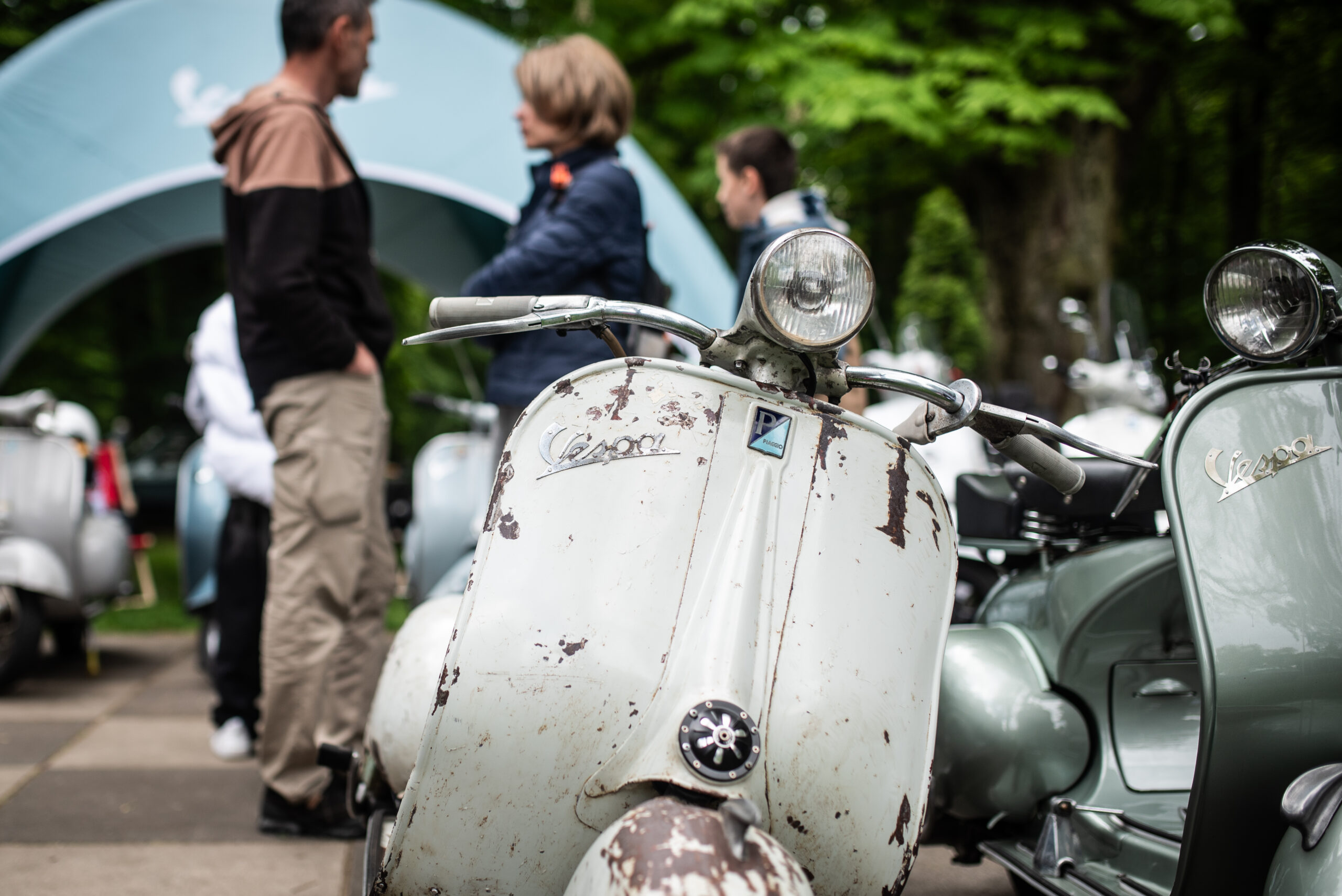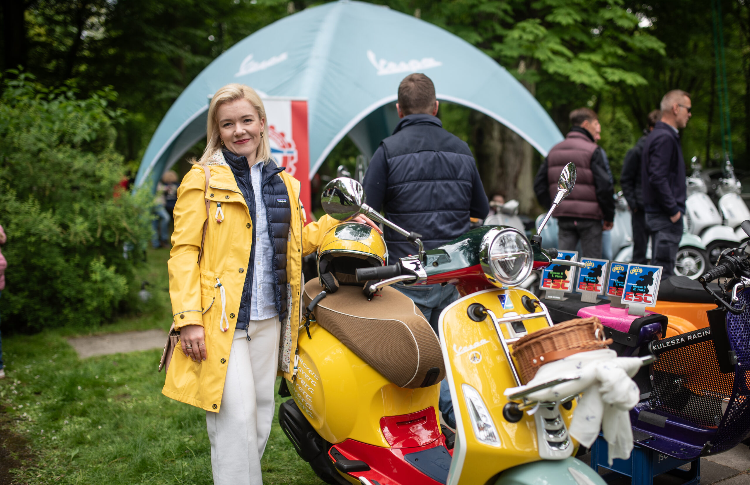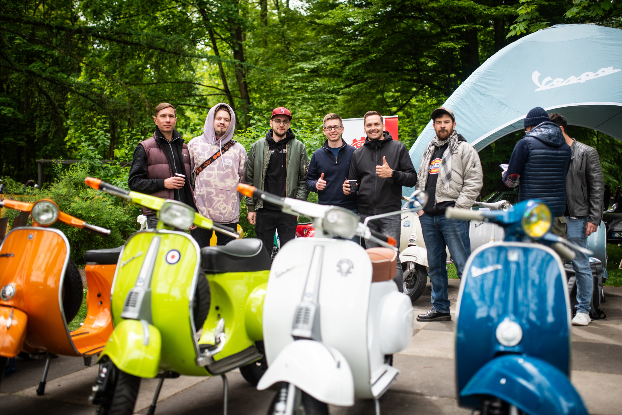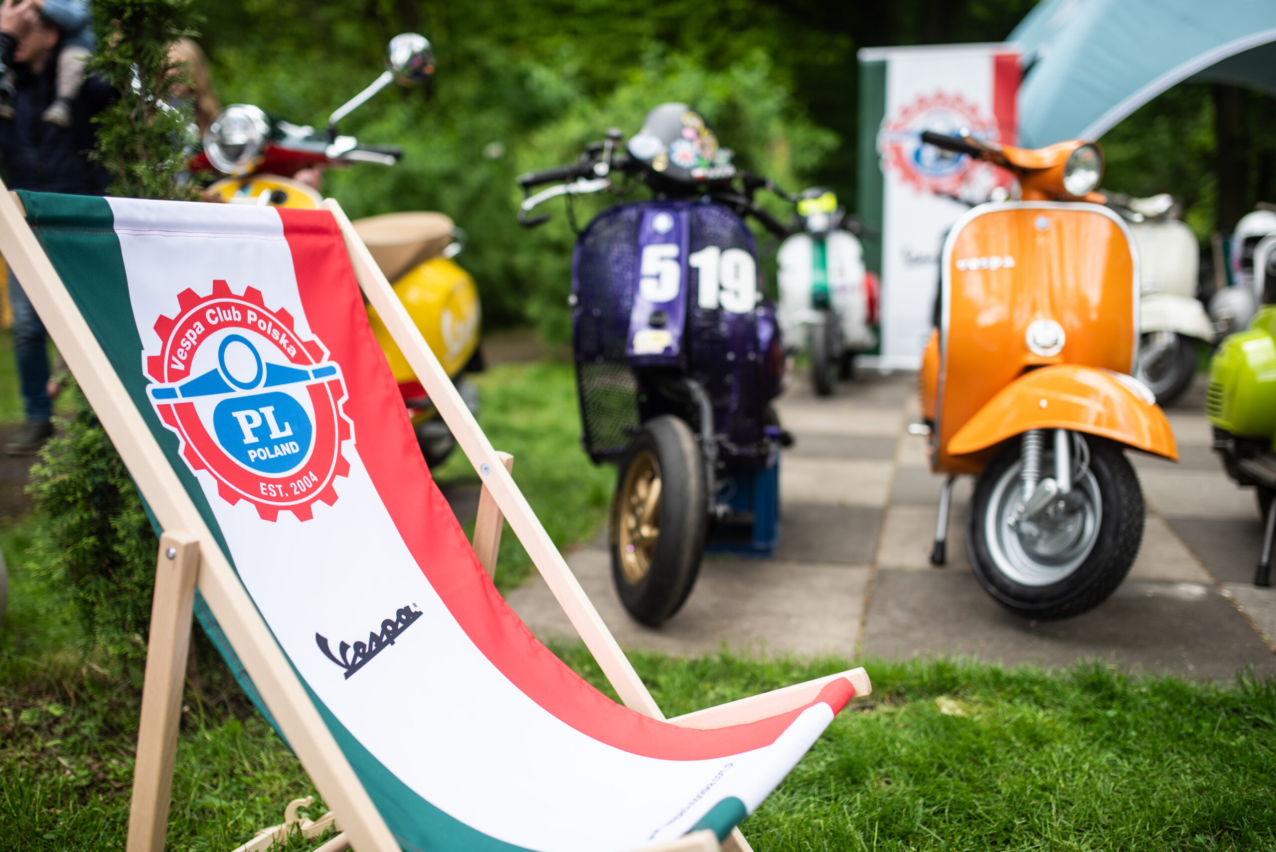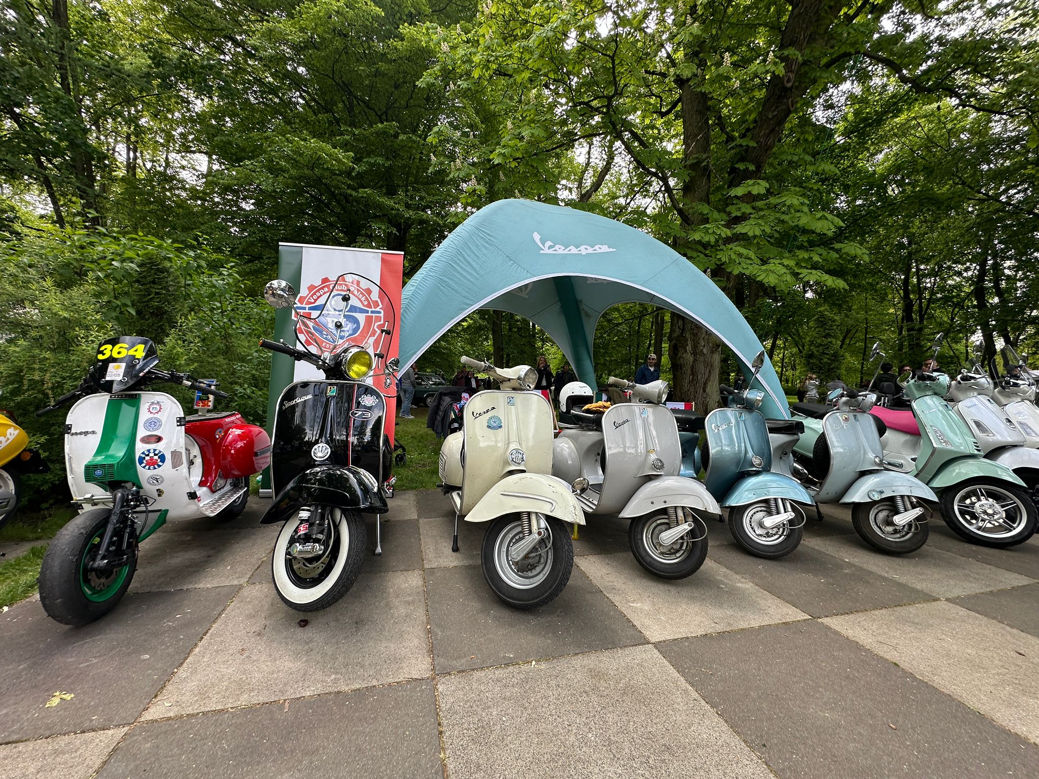 Na terenie eventu pojawiliśmy się chwilę po godzinie ósmej rano. Pierwsze działania skupione były wokół wypakowania Vesp z naszych busów. Następnie podjęliśmy się aranżacji naszego stoiska w postaci postawienia ogromnego namiotu sygnowanego logiem Vespa, pachnących nowością flag klubowych, dziesięciu leżaków z motywem włoskich barw oraz banerów. Takie przygotowanie z pompą było możliwie dzięki wsparciu głównego importera Vespa Polska w osobach Joanny i Wioletty, które wespół z nami stawiały nasze wspólne stoisko!
