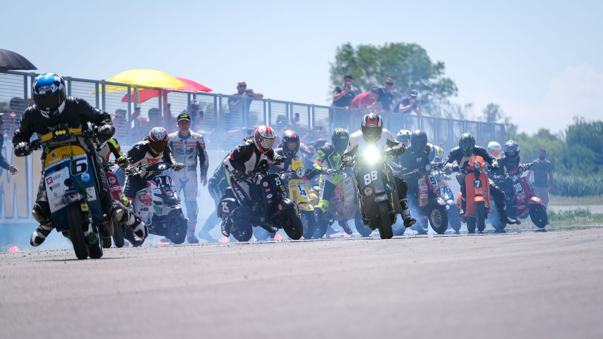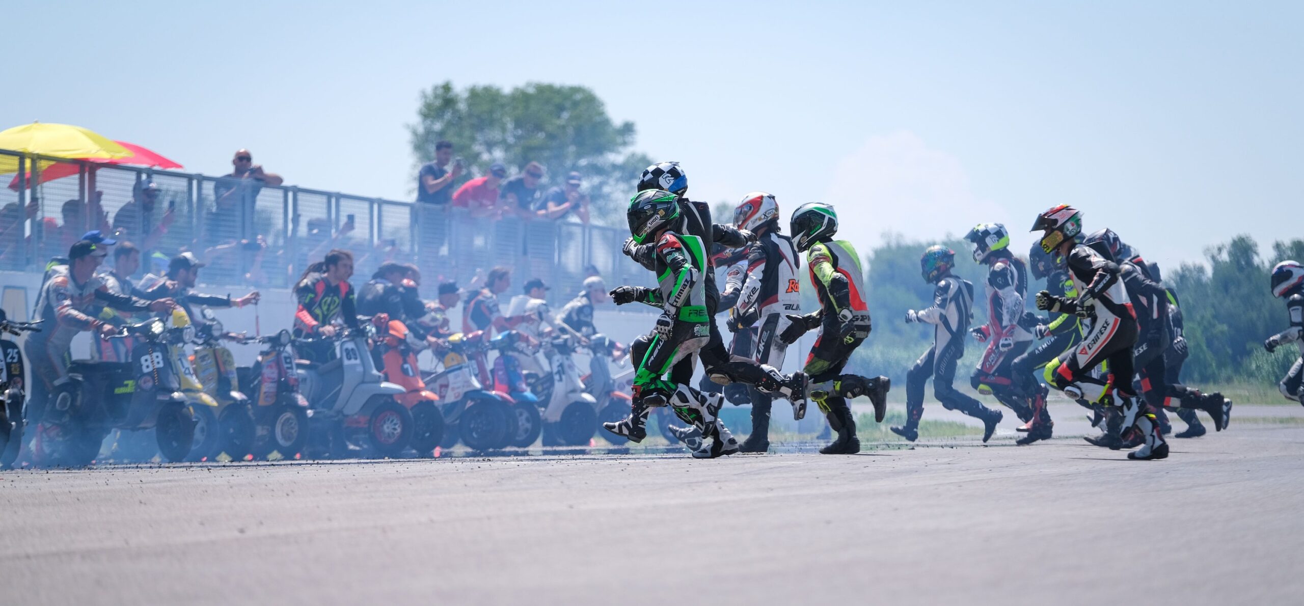 O 9.30 rozpoczął się godzinny trening czasowy decydujący o kolejności ustawienia na starcie. Przy okazji sprawdzano również działanie systemu pomiaru czasu. Niestety z naszego teamu na tor wyjechałem tylko ja i nie błysnąłem zbytnio – nasz skuter do wyścigu miał ruszyć z ostatniego pola startowego! Dokładnie w samo południe, dyrektor wyścigu dał sygnał do startu! Kierowcy ustawieni w rzędzie po jednej stronie toru, rzucili się do swoich maszyn, czekających na nich po przeciwnej stronie prostej start – meta. Ich silniki już pracowały, uruchomione wcześniej przez pomocników z zespołu. Właśnie tak wygląda start typu „Le Mans”!