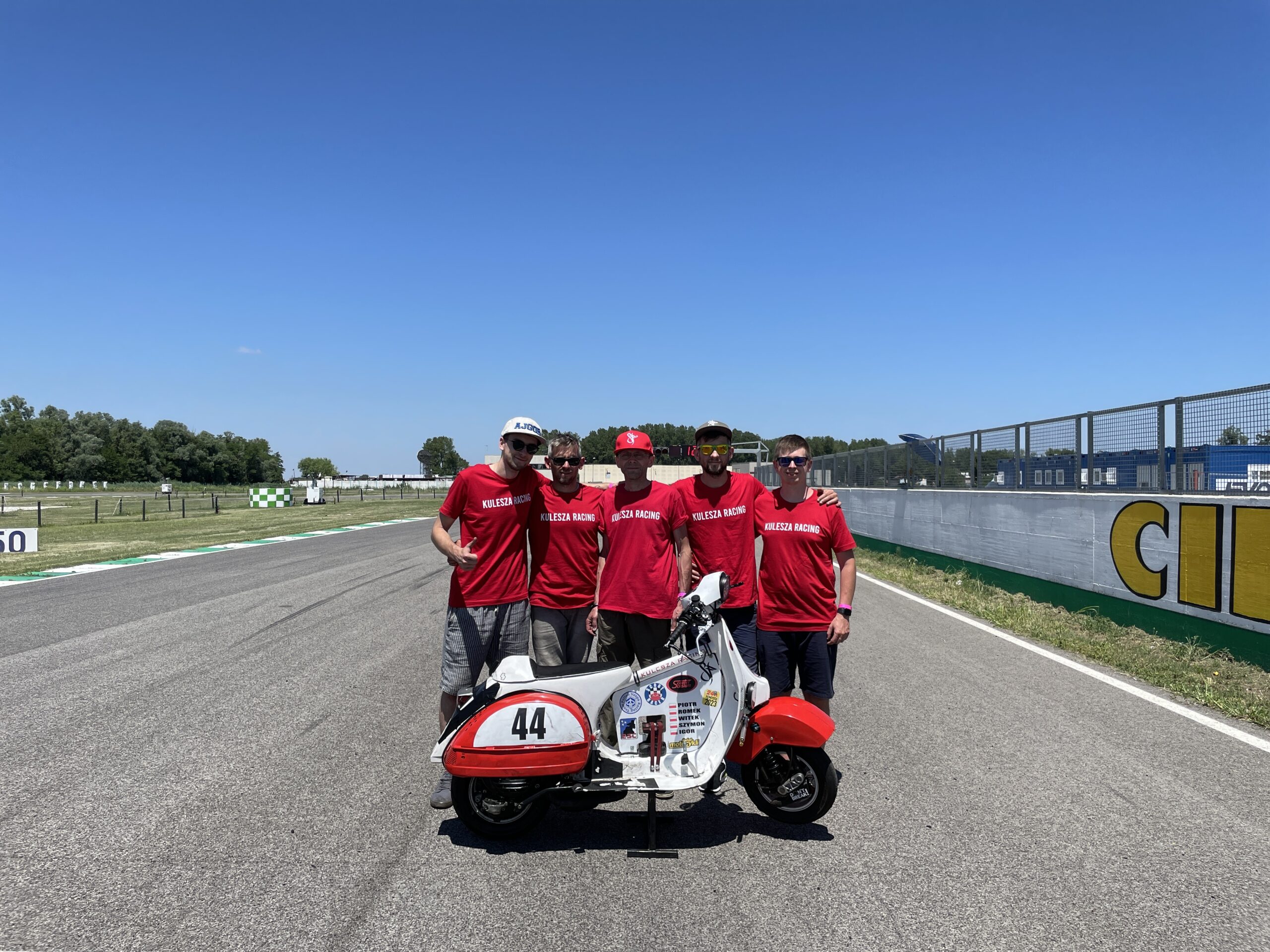 Piątek rozpoczął się od odbiorów technicznych sprzętu. Oprócz samych maszyn, dość szczegółowej inspekcji podlegały wszystkie elementy wyposażenia kierowców: kaski, kombinezony, buty i rękawiczki. Niektóre zespoły od razu też przystąpiły do treningów na torze. My potrzebowaliśmy nieco więcej czasu na odpoczynek po długiej podróży, nie spieszyliśmy się więc z wyjazdem na tor. Tylko Romek, który przybył na miejsce już w czwartek, zgłosił się na ochotnika jako kierowca testowy. Należało oczywiście sprawdzić i odpowiednio wyregulować silnik naszej Vespy. Temperatura przekraczająca 30 stopni Celsjusza nie ułatwiała tego zadania zarówno mechanikom jak i kierowcy, który musiał wielokrotnie wyjeżdżać na tor, za co należy mu się najwyższe uznanie!