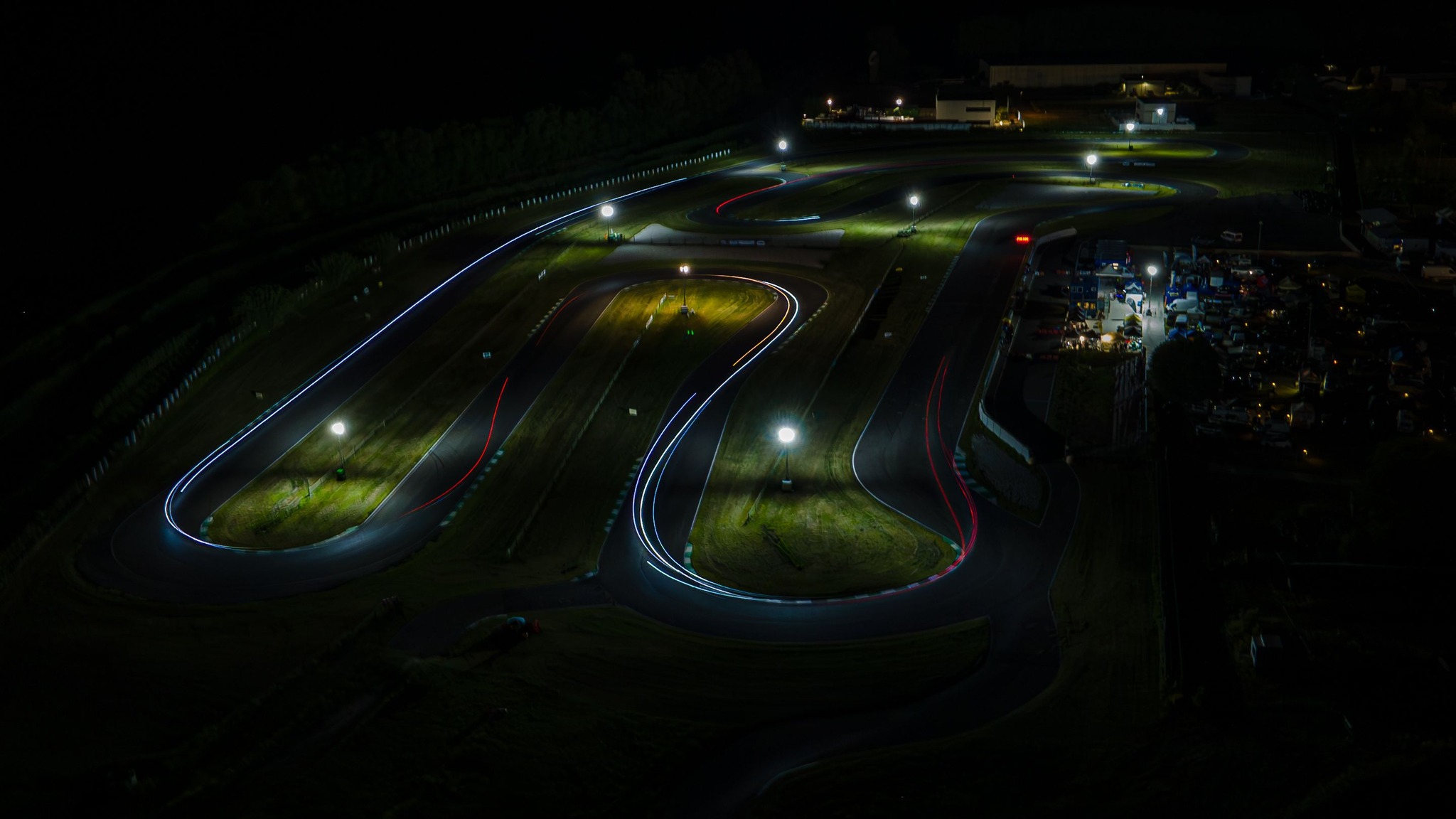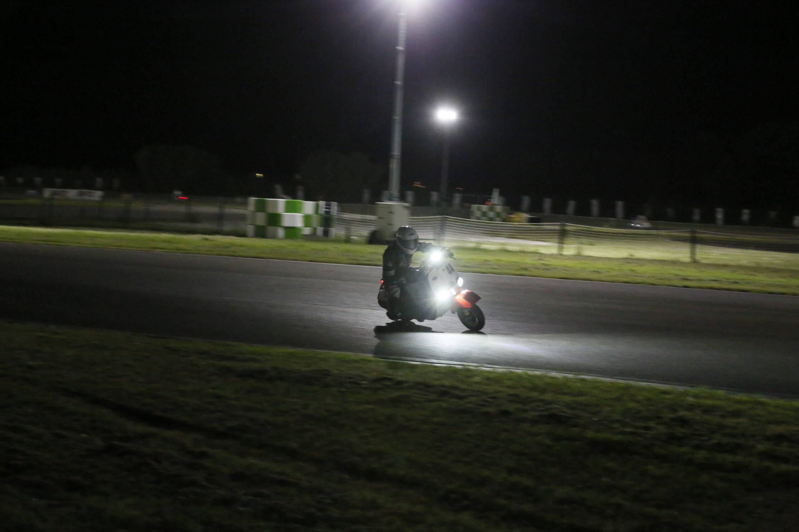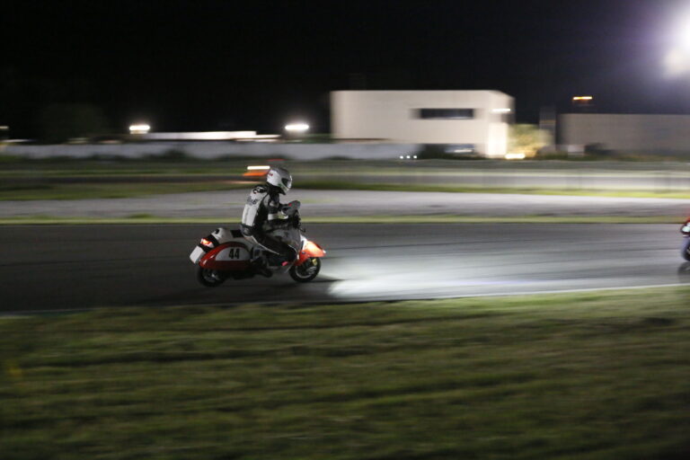 O 21.30 tuż po zmroku rozpoczął się obowiązkowy dla wszystkich trening nocny. Każdy z nas miał okazję zapoznać się z torem i poczuć nieco atmosferę wyścigu przy sztucznym oświetleniu. Obaj z Igorem trenowaliśmy już kilka lat temu w takich warunkach na torze Modlin, ale wówczas nasze skutery nie były wyposażone we własne reflektory. Teraz ścigające się maszyny musiały mieć odpowiednio mocne lampy, zapewniające kierowcy doskonałą widoczność w każdej sytuacji. Sam wyścig nie odbywa się oczywiście w całkowitych ciemnościach. Wokół toru zostały rozstawione specjalne generatory prądu wyposażone w wysokie maszty, na szczycie których umieszczono po 4 lampy. Podczas treningu mieliśmy również możliwość przećwiczenia procedur tankowania, zmiany kierowców i szybkich przeglądów maszyn.